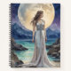 Una doncella vestida de blanco se encuentra junto al mar bajo la luz de la luna llena, creando un momento de serenidad y contemplación en la noche. La luna brilla sobre el agua, iluminando la escena con un resplandor mágico.
