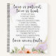 L'amour est patient, l'amour est gentil. Il ne fait pas l'envie, il ne se vante pas, il n'est pas fier. Il ne déshonore pas les autres, il n'est pas égoïste, il n'est pas facilement irrité, il ne tient aucun compte des torts. L'amour ne se réjouit pas du mal mais se réjouit de la vérité. Il protège toujours, toujours faire confiance, toujours espérer, toujours persévérer. L'amour n'échoue jamais. 1 Corinthiens 13:4-8. L'amour est le carnet en spirale patiente, cadeau Anniversaire, cadeau Mariage, cadeau de Saint-Valentin, don d'amour.