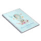 Un carnet en spirale avec une charmante illustration d'un bébé lapin qui roule le long d'une montgolfière décorée de coeurs, d'un ruban, de fleurs et de papillons.