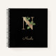 Le carnet noir élégant est doté d'un monogramme botanique doré au centre.