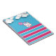 Ce dessin montre une licorne heureuse tenant une grande lollipop, volant sous des nuages blancs avec un arrière - plan rayé coloré