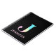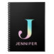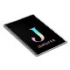 Carnet noir personnalisé chic avec un monogramme initial "J" en gros caractères gras avec un dégradé rose, jaune, vert menthe et bleu ciel turquoise. Ajoutez votre nom ci-dessous en simple typographie rose.