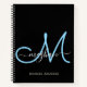 Cahier à reliure spirale personnalisé moderne et tendance, noir et bleu clair avec monogramme. Ce design simple et élégant présente un nom en lettres cursives blanches avec enjolivures blanches et un énorme monogramme manuscrit de couleur bleu ciel clair, ou bleu bébé, sur fond noir. Ce cahier féminin et joli est une idée de cadeau parfaite pour le travail, l'école, une fête d'anniversaire, un mariage et toute autre occasion ou fête pour quelqu'un qui aime les styles girly et modernes. Si vous avez besoin d'aide ou d'un article assorti, veuillez contacter le concepteur.