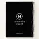Le carnet gaucher moderne présente un design minimal dans une palette de couleurs noir et blanc classique. Nom personnalisé présenté dans le centre en police simple design avec un médaillon de monogramme minime gratuit. Montré avec un nom personnalisé et une initiale monogramme sur le devant de la typographie moderne, ce carnet d'affaires personnalisé est conçu avec du texte personnalisé que vous pouvez customiser en changeant le texte à l'aide des champs fournis. La spirale est à droite pour la commodité de la gauche. Pour créer votre propre carnet personnalisé : 1. Sélectionnez personnaliser ce modèle. 2. Remplacez le texte. 3. Vérifiez votre conception pour le dimensionnement et le placement. Un carnet minimaliste moderne pour la maison ou le bureau, un carnet monogrammé simple et moderne pour votre espace de travail. Idéal pour les consultants, les avocats, les agents immobiliers, les entraîneurs d'entreprise ou de direction, ou tout autre professionnel d'affaires, ou un cadeau de bureau réfléchi pour lui ou elle.
