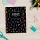 Retour au carnet scolaire personnalisé avec nom et sujet, avec un motif de lettres colorées, grandes et petites.