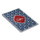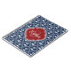 Un motif d'ancre bleu et blanc marine dans un arrière - plan en forme de losange. Sur le motif arrière - plan se trouve un cadre étiquette en forme de quatrefoil rouge et élégant, avec un nom personnalisable et des modèles monogrammes.