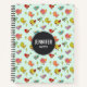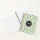 Un carnet avec un motif d'oiseaux lunaires dessinés à la main. De mignons petits pins verts les séparent. Un cercle noir superposé avec votre nom et votre tite/sujet à l'intérieur.