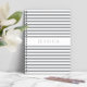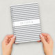 Carnet spirale avec une impression de nom personnalisée sur un motif rayé gris et blanc minimaliste.