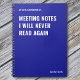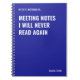 Carnet amusant pour les collègues de bureau, les gestionnaires, les amis de travail ou d'autres professionnels de l'administration et des affaires. Personnalisez le nom à imprimer en bas de la couverture "Notes de réunion Je ne lirai plus jamais". Les carnets personnalisés sont parfaits pour les anniversaires de travail, les vacances, les échanges de cadeaux de bureau et plus encore!