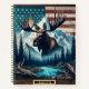 Une orignale royale émerge près d'une rivière tranquille, encadrée par de grands arbres et des montagnes majestueuses sous un ciel d'étoiles et de rayures.