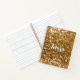 Un nom moderne en gras en blanc avec une ombre portée noire sur un carnet vierge. La taille, la couleur et le style de la police sont personnalisables. L'arrière - plan est un faux confetti or ou une parties scintillant de paillettes avec des taches brillantes ou des boules floues.