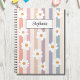 Ce joli cahier présente des marguerites blanches sur un fond rayé de couleurs pastel.