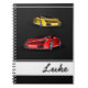 Le Carnet photo est présenté avec un arrière - plan noir et avec un imprimé de voiture sport rapide de fantaisie. Personnalisé Nom, customisez cet élément et changez le nom à votre nom ou même retirez le nom si vous le souhaitez et ajoutez un autre texte.