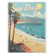 Ce cahier de San Diego présente un design de poster de voyage de style vintage, capturant l'ambiance ensoleillée et décontractée de la plage de la ville. La couverture met en vedette une scène de plage classique avec des palmiers, des surfeurs et une jetée, le tout avec l'horizon du centre-ville à l'arrière-plan. Ce cahier à spirale est parfait pour le journalisme, les notes ou comme un cadeau unique pour quiconque aime le charme rétro et côtier de San Diego.