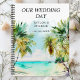 Ce carnet élégant et magnifique ferait un grand wedding planner, album photo, livre d'invité et plus encore. Le design comprend une plage aquarelle, un ciel bleu et des palmiers. Le texte combine écriture manuscrite et polices sans serif pour un look élégant et moderne. Il est parfait pour une plage d'été ou un mariage de destination tropicale.