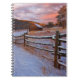Cette photo comporte une grange rustique couverte par neige devant un beau coucher du soleil sur un ranch du Colorado.
