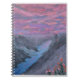 Eaux coulant à travers des montagnes accidentées sous un ciel crépusculaire rose, capturant les souvenirs et l'innocence de l'enfance.