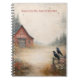 This notebook design features a softly illustrated rustic farm scene with a classic red barn set among misty evergreen trees. A winding dirt path leads into the distance, creating a peaceful sense of depth and open space. In the foreground, two black crows perch quietly on a weathered wooden fence, adding a distinctive, slightly mysterious touch to the composition, while additional crows glide across the pale, atmospheric sky. Wildflowers in warm, muted tones frame the path and barn, enhancing the nostalgic, painterly feel. The overall look is calm, rustic, and nature-inspired—ideal for journaling, note-taking, or everyday writing. Personalize with your own name
