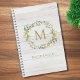 Rustic Wood Floral Watercolor Monogram Notebook. A dainty, boho watercolor wreath with your custom monogram and name in an elegant gold serif typography. This design features a warm, light wood rustic background.
