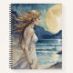 Una doncella vestida de blanco se encuentra junto al mar bajo la luz de la luna llena, irradiando serenidad y paz. La escena es un reflejo de la armonía entre la naturaleza y la figura humana.