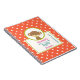 carnet en spirale baby shower. Conçu avec un mignon petit singe tenant une sucette dans sa bouche à l'intérieur d'un cercle avec une bordure verte d'olivier. L'arrière - plan est un motif à pois orange et blanc. Les lettres dans le mot bébé sont suspendues à une flèche de style boho.