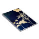 Photographie de cyanotype artisanal de marigolds dorés sur un carnet en spirale vierge.