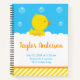 Ce carnet mignon et amusant présente un adorable canard jaune en bulles de bain savonneuses blanches sur un arrière - plan bleu vif avec un ruban orange et des rayures jaunes. Le texte combine écriture manuscrite et polices sans serif pour un look élégant et moderne. Il peut être personnalisé avec les statistiques de naissance de votre bébé, comme le nom, la taille, la date et l'heure de naissance, ou si vous souhaitez le donner comme cadeau de douche vous pouvez modifier et supprimer du texte.