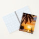 Une paisible plage tropicale plantée de palmiers, et un voilier au loin en silhouette face au soleil couchant, forment un beau carnet en spirale.