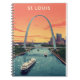 Ce carnet de St. Louis présente une illustration de style vintage de l'arc Gateway surplombant la rivière Mississippi au coucher du soleil. L'art de la couverture capture le monument emblématique et un bateau classique de la rivière, célébrant le charme historique et architectural de la ville. Ce carnet en spirale est parfait pour le journalisme, les notes, ou comme un cadeau unique pour quiconque aime l'attrait rétro de la "Porte de l'Ouest".