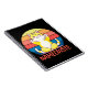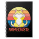 Illustration colorée avec la conception de texte "Nameowste" et chatte Kawaii mignon fait du yoga sur un arrière - plan rétro rayé coloré