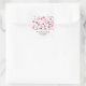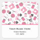 Un autocollant d'adresse avec un design à thème de couture composé d'une machine à coudre, des bobines de fil, un coussin d'épingle, des ciseaux, des nuances de tissu et des aiguilles à coudre. Le design est assorti à des couleurs roses.