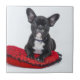 Adorable chiot taurin noir et blanc assis sur un coussin rouge royal.