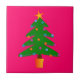 Illustration of a bright green Christmas tree. A gold star sits on top and the tree is dressed up with pink, blue and orange decorations.