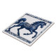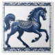 Un saphir, surgelé dans une posture à mi-hauteur, occupe le devant de la scène sur ce carrelage en céramique. Une tapisserie florale complexe orne le corps du cheval, la crinière qui coule et la queue, jusqu'à sa selle ou son harnais décoratifs. L'artiste capture habilement les muscles puissants de l'animal et son mouvement gracieux. Une bordure de motifs floraux détaillés dans la même teinte bleue profonde encadre la composition. L'agencement symétrique et une perspective légèrement surélevée mettent en évidence la posture dynamique du cheval. Couleurs feutrées et éclairage constant créent une atmosphère sereine et vintage, évocatrice de carreaux classiques. Ce design méticuleusement rendu incarne la beauté et l'art classiques.