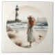 Une jeune femme gracieuse, vêtue d'une robe blanche qui coule le long du rivage sablonneux, son casquette du soleil penche contre la brise en contemplant un phare rayé debout contre les vagues. Des herbes douces encadrent l'avant-plan tandis que des oiseaux marins et un voilier dérivent à travers l'horizon, ajoutant un sentiment de mouvement calme au paysage côtier. La douce aquarelle mêle romantisme et sérénité, créant une scène balnéaire intemporelle d'inspiration cottagecore, à la fois nostalgique et rêveuse. L'IA a généré des oeuvres d'art.