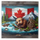 Un castor construit un barrage au bord d'une rivière, entouré d'arbres et de montagnes, et un drapeau canadien est affiché en bonne place dans l'arrière - plan.
