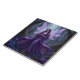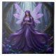 Une belle fée portant une robe violette coulante et un collier d'améthystes avec des violettes dans ses longs cheveux violets et des ailes violettes violettes légères en forme de libellule pourpre tenant une violette se dresse dans une forêt magique entourée de champignons colorés, de fleurs et d'arbres mossy recouverts de vignes.