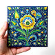 Le carrelage "Celestial Harmony" d'Iznik présente un motif floral traditionnel asymétrique avec des fleurs bleues, jaunes et blanches détaillées accompagnées de feuilles verts verdoyants, le tout contre un riche arrière - plan bleu. Ce design méticuleusement travaillé illustre l'élégance et le raffinement de la céramique d'Iznik, une forme d'art ottoman réputée pour ses couleurs vives et ses motifs complexes. Le mélange harmonieux de teintes et de détails exquis en fait un exemple saisissant de la beauté et de l'attrait intemporel de l'art Iznik.