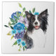 Coincé dans cet arrangement de fleurs bleues et violettes est une belle aquarelle image d'un Collie Bordure noir et blanc. Tout est posé sur un arrière - plan blanc.