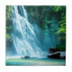 Carreaux en céramique illustrant une cascade en bleu pâle avec un spray blanc, entourée de blocs et de feuilles verts