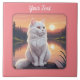 Belle chatte blanche à cheveux longs assise au bord d'un lac au coucher du soleil. Ajoutez cette image à d'autres produits. Ajoutez aussi votre propre texte. Modifier la couleur arrière - plan. Beaucoup d'animaux dans mon magasin.