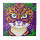 Carrelage en céramique à l'image d'un chat mignon orné d'un masque aux couleurs festives de Mardi Gras. Le mélange de violet, de vert et de jaune doré reflète les teintes traditionnelles de la célébration
