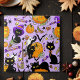 Chats noirs mignons parmi les citrouilles, bonbons d'halloween, chauves-souris, balai, étoiles, maïs bonbon, glands, pleine lune, feuilles d'automne et un fantôme coupé, le tout dans un décor violet clair
