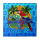 Le temps d'île est une référence à la façon dont la vie est sur des îles, les gens sont plus susceptible de ralentir et apprécier la vie. Plutôt que la foire d'empoigne normale nous vivons dedans sur la terre principale. Beau coucher du soleil de plage derrière des planches de surf et des palmiers, encadrés avec des fleurs de bambou et de ketmie. Et un perroquet coloré d'ara.
