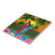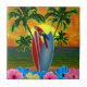 Le coucher du soleil tropical et coloré d'océan derrière des planches de surf, palmiers, un perroquet d'ara était perché sur les panneaux de surf, et la ketmie fleurit au fond.