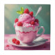 Illustration douce d'une tasse de café remplie de crème glacée rose recouverte de framboises.