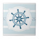 Ce carreau de céramique a un thème nautique avec les rayures volumineuses bleues molles à l'arrière-plan avec une conception de corde au milieu. Centré est un cadre blanc avec la roue d'un bateau nautique bleu-clair. Quelques éléments de conception sont marché de graphique de copyright