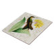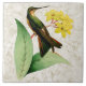 Illustration vintage de caractéristiques de conception de trépied de carreau de céramique du plus grand membre de la famille de colibri - le colibri géant (gigas de Patagona.) Des perches vertes et brunes de colibri sur un arbuste jaune de frangipani (Plumeria Jamesoni) avec un fond clair de motif de marbre d'or.