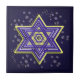 Cette jolie tuile comporte un Magen David complexe tissé dans les tonalités de bleu et de jaune, sur un champ de plus petites étoiles. Arrière - plan bleu-foncé.