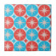 Il s'agit d'élégantes starbursts blancs rétro du milieu du siècle sur des cercles rouges et bleus motif. C'est un magnifique carreau en céramique pour tous ceux qui aiment les modèles rétro géométriques moyen mod